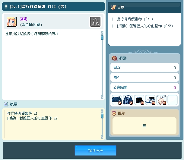 ※參考※可配合 [活動] 裁縫匠人的心血巨作 兌換當期「流行精選服飾」。