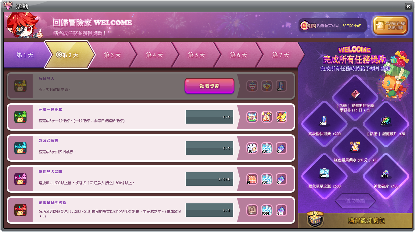 -任務一共7天,完成任務時可獲得對應獎勵。