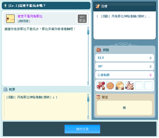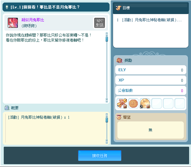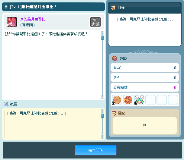 可向「爬呀爬活動→NPC肯定不是月兔耶比」領取並完成任務