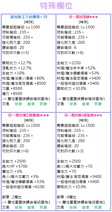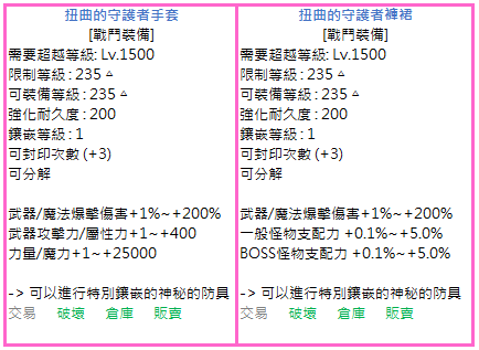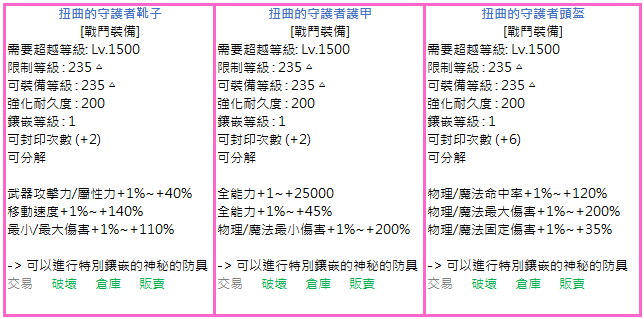 ▷ [另一面的守護者]套裝擁有基本80%的強化機率 ▷ [扭曲的守護者]套裝根據鑲嵌數值的不同,決定裝備的性能 ▷ 新的特殊欄位裝備可進行物理/魔法統合的新鑲嵌功能 ▷ 新的特殊欄位裝備最多可鑲嵌至20等級,且擁有基本80%的成功機率 ▷ 新的防具、項鍊、徽章等道具可在夢境奧涅伊洛獲得 ▷ 新的腰帶道具可在魔力防空洞獲得 ▷ 新道具在進行封印後可交易