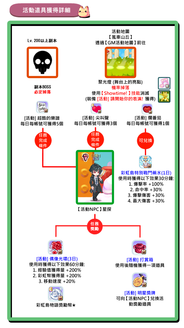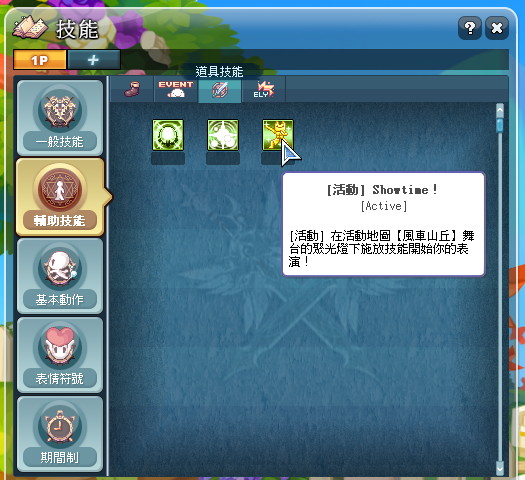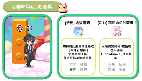 ►裝備活動道具【請開始你的表演!】後獲得活動技能【Showtime!】。