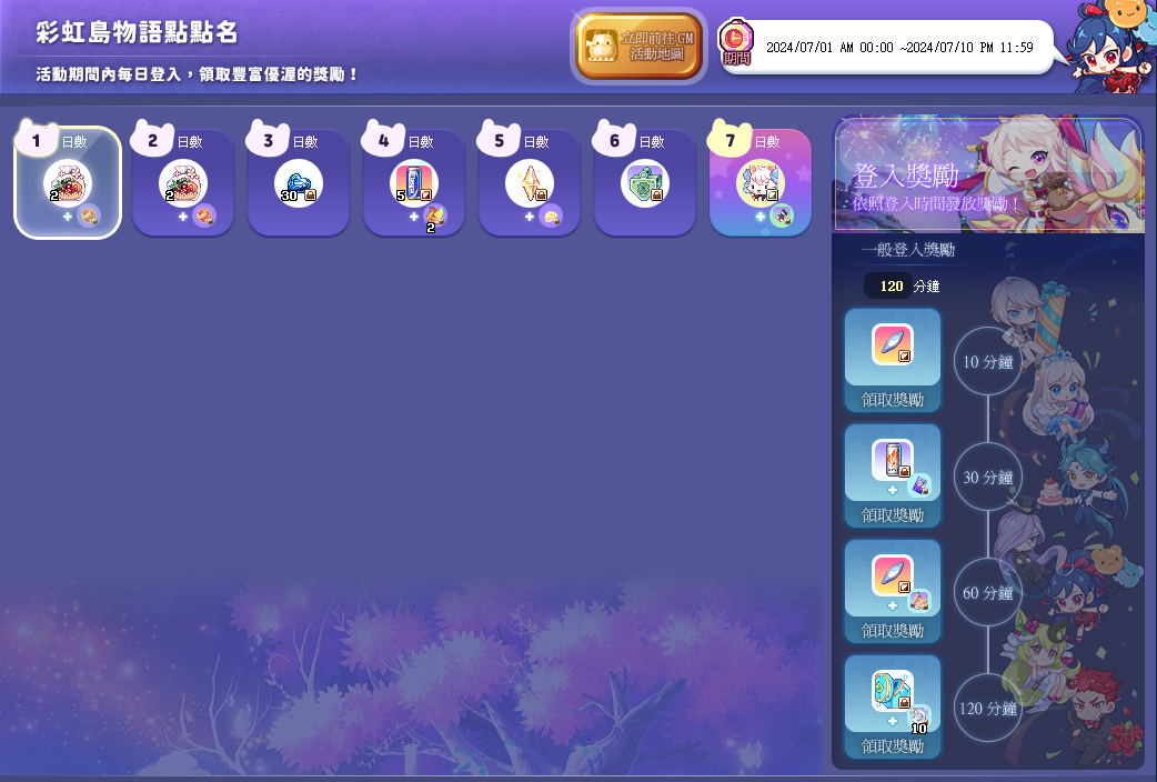 彩虹島點點名改版前夜祭 【活動名稱】彩虹島點點名改版前夜祭 ※點擊圖片可開啟新視窗瀏覽 【注意事項】 1. 時限性物品會於領取後開始計算使用天數(包含離線時間)。 2. 如遇不可抗拒之因素,樂意傳播保有隨時修改活動辦法及獎項或中止本活動之權利。 3. 實際功能以遊戲內容為主,樂意傳播股份有限公司保留最終解釋權。 4. 其他未規定事項,官方會依據狀況於遊戲網站或遊戲中公告或補充,參加者不得異議。
