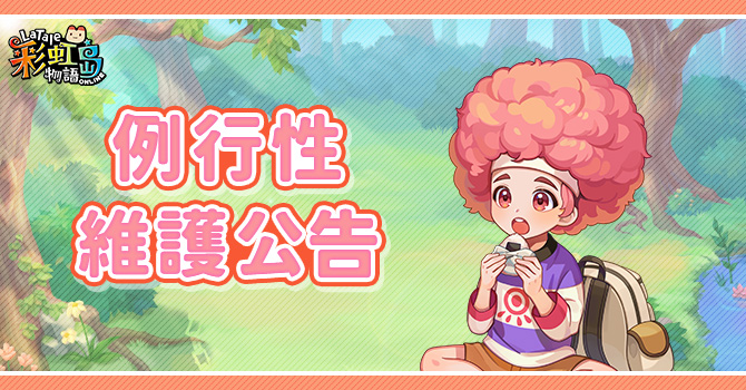 『彩虹島物語Online』將於03月26日(四) 08:00 ~ 16:00進行例行性維護作業, 請全體島民提前下線,於伺服器維護作業期間相關儲值轉點及官網將暫停服務, 如維護作業提前完成,將會另行公告通知,請島民多加留意,謝謝。 【本次更新重點】